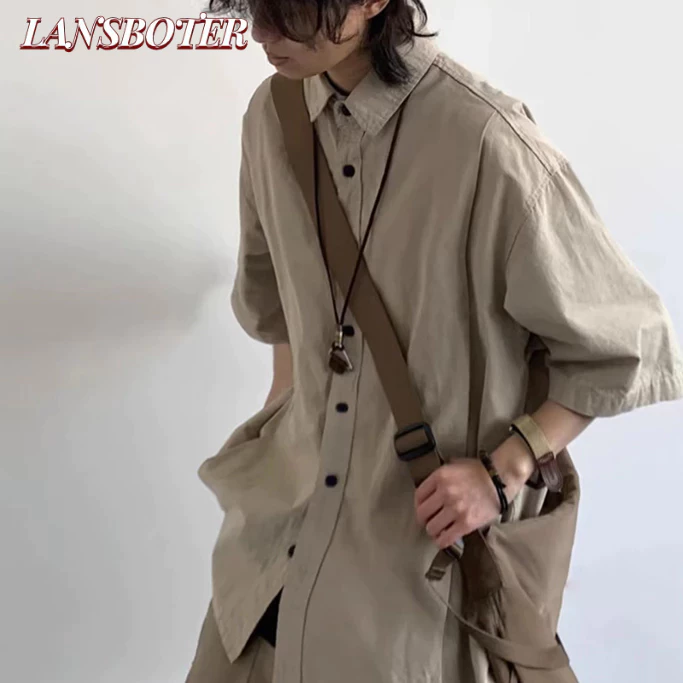 LANSBOTER Áo sơ mi nam tay ngắn phong cách Nhật Bản đơn giản màu trơn kiểu đại học
